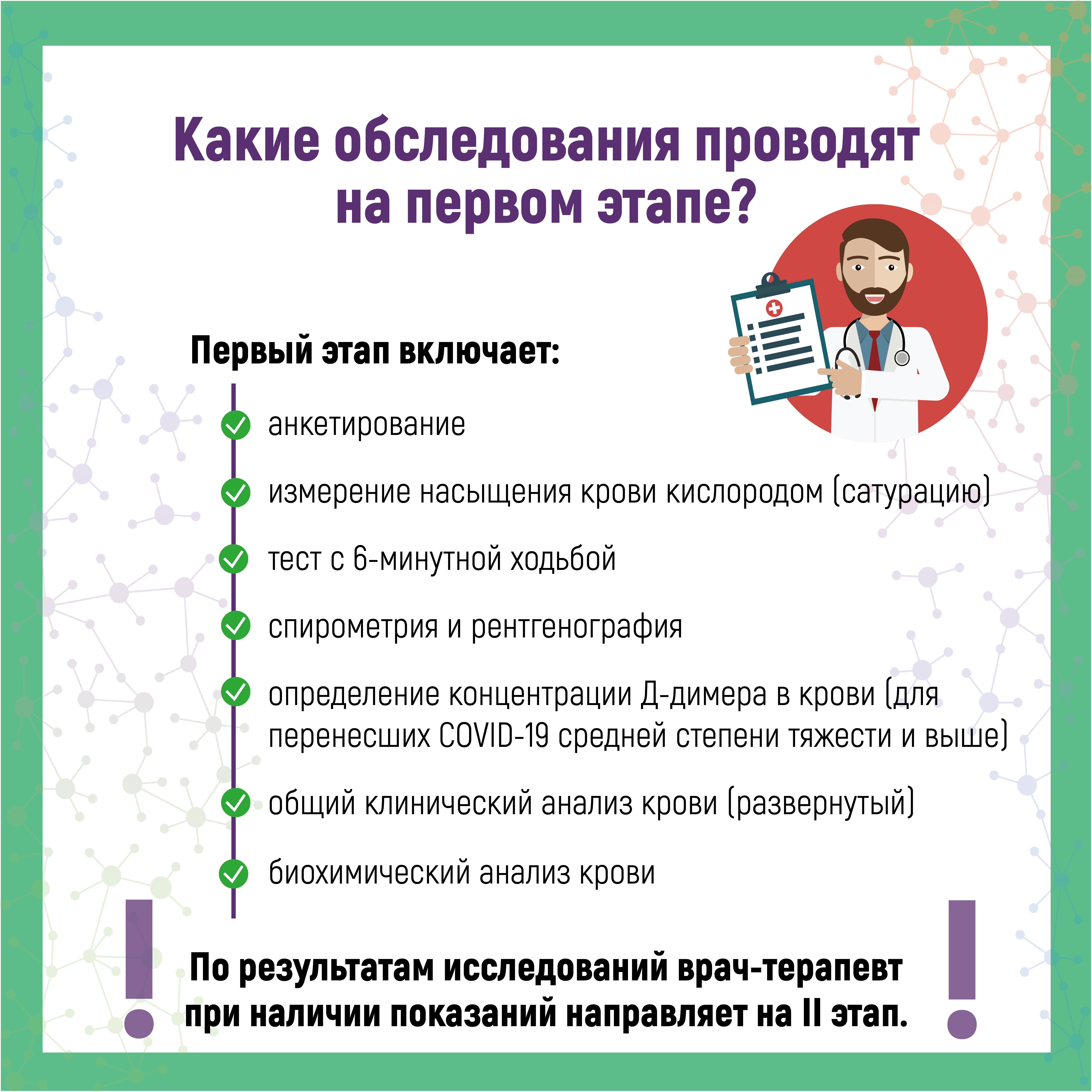 Данное обследование является дополнением к проводимым профилактическим осмотрам и диспансеризации взрослого населения. Углубленная диспансеризация проводится в 2 этапа и включает в себя: